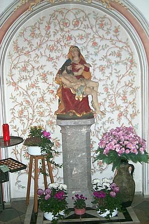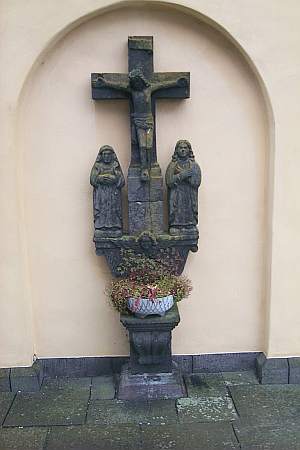 Katholische Pfarrkirche von 1705. Erweiterung 1832-35. Hochaltaraufsatz um 1700. Außen an der Kirchenmauer Kreuzigungsgruppe aus Basaltlava von 1694. [1]