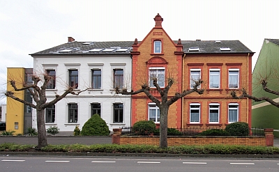Das traufständige Doppelwohnhaus, 1897 nach Plänen des Maurermeisters Hansen für die Gebrüder Marx mit Anklängen an die deutsche Renaissance erbaut, setzte die Reihe der etwas anspruchsvolleren Wohnbauten an der Koblenzer Straße fort.